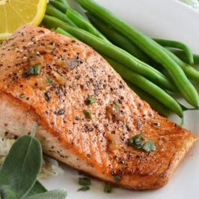 Atlantic Salmon with fresh Lemon Garlic Sauce, Served with Garlic Rice & Quinoa Blend and Green Beans